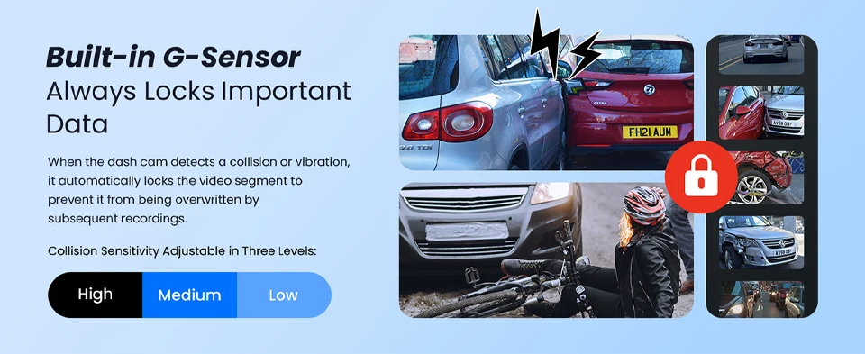 When your car is subjected to an impact or other emergency, the G sensor is triggered, so that the recorder immediately records and locks the video.