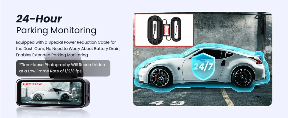 Taking a 16G memory card as an example, only about one hour of video can be recorded in the 30-frame per second mode. After the time-lapse recording function is enabled, recording time under 1 frame per second mode will reach 30 hours (more than 24 hours), which will increase the maximum recording time and data storage by 30 times, ensuring the integrity of the recorded content, greatly saving memory Card space and protect your vehicle for more than 24 hours.(Note: Need to buy a Hardwire Kit)
