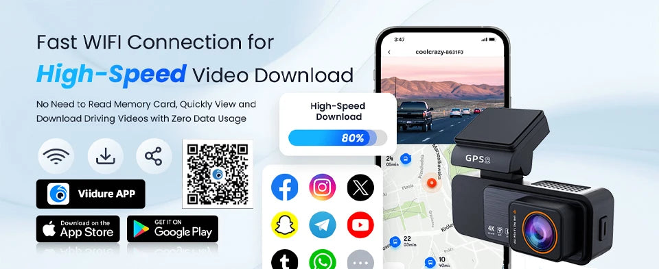 Use the app to view, play, and manage dashcam videos in real time on your iOS and Android devices. Through the app, you can download the recorded 4K videos directly to your phone, or share your travel scenery and highlight moments to your social media with one click.