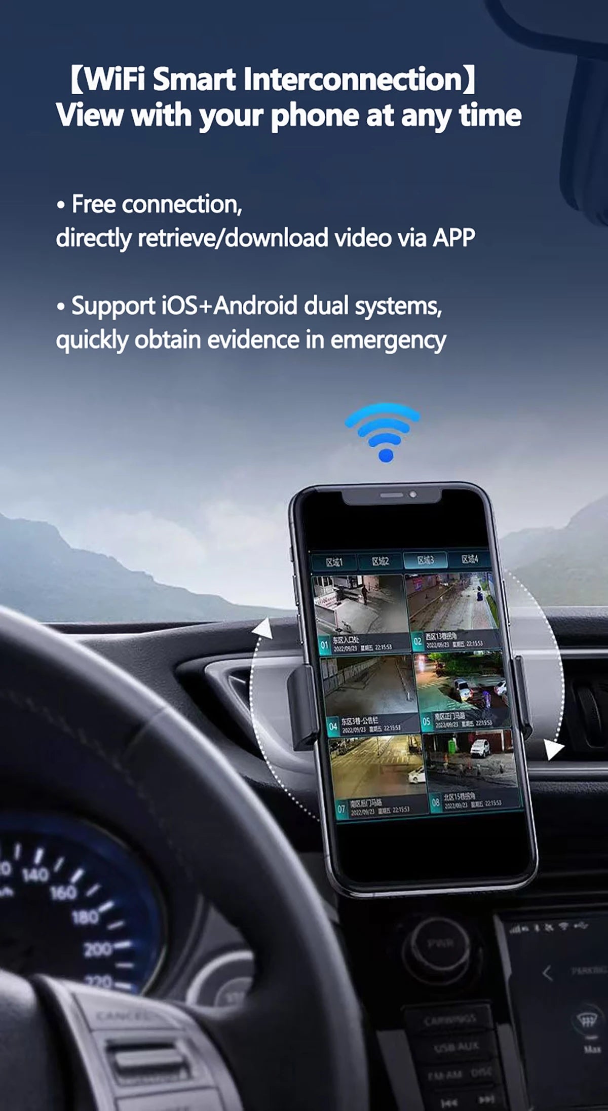 Fast wireless transfers: View/download 4-channel videos or locked collision clips anytime—no card removal.