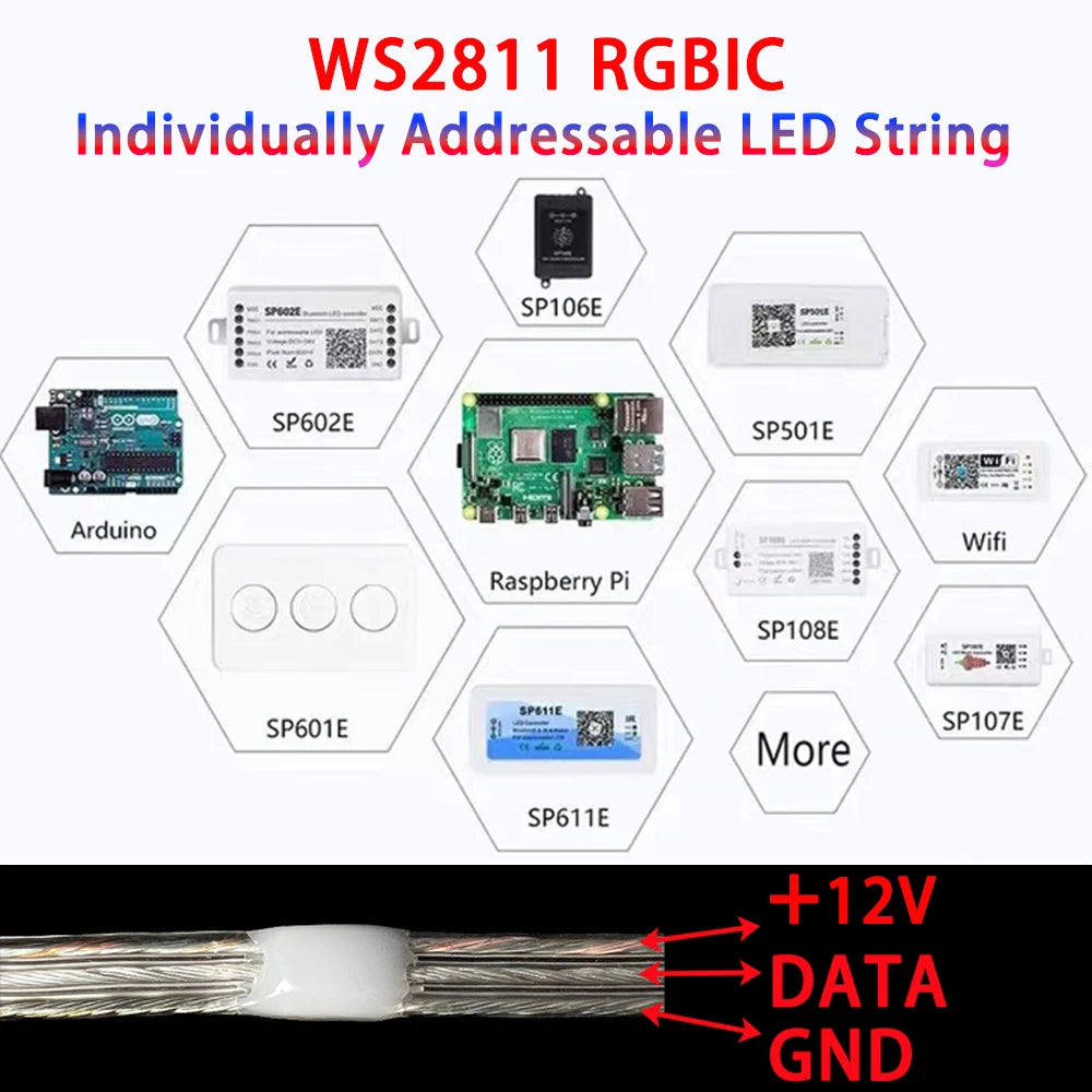 DIY Controllers: Each pixel can have its own color and brightness as your wish. Compatible with Arduino, Raspberry Pi, Teensy, T1000S,K1000C etc programmable controllers. Support SP110E SP105E SP108E SP110E SP601E etc Bluetooth APP IR controllers, CSY07 CSY08 X2 SP106E SP107E SP601E SP608E SP611E etc music bluetooth APP controllers,SP511E SP501E etc smart WiFi Alexa music Controllers.