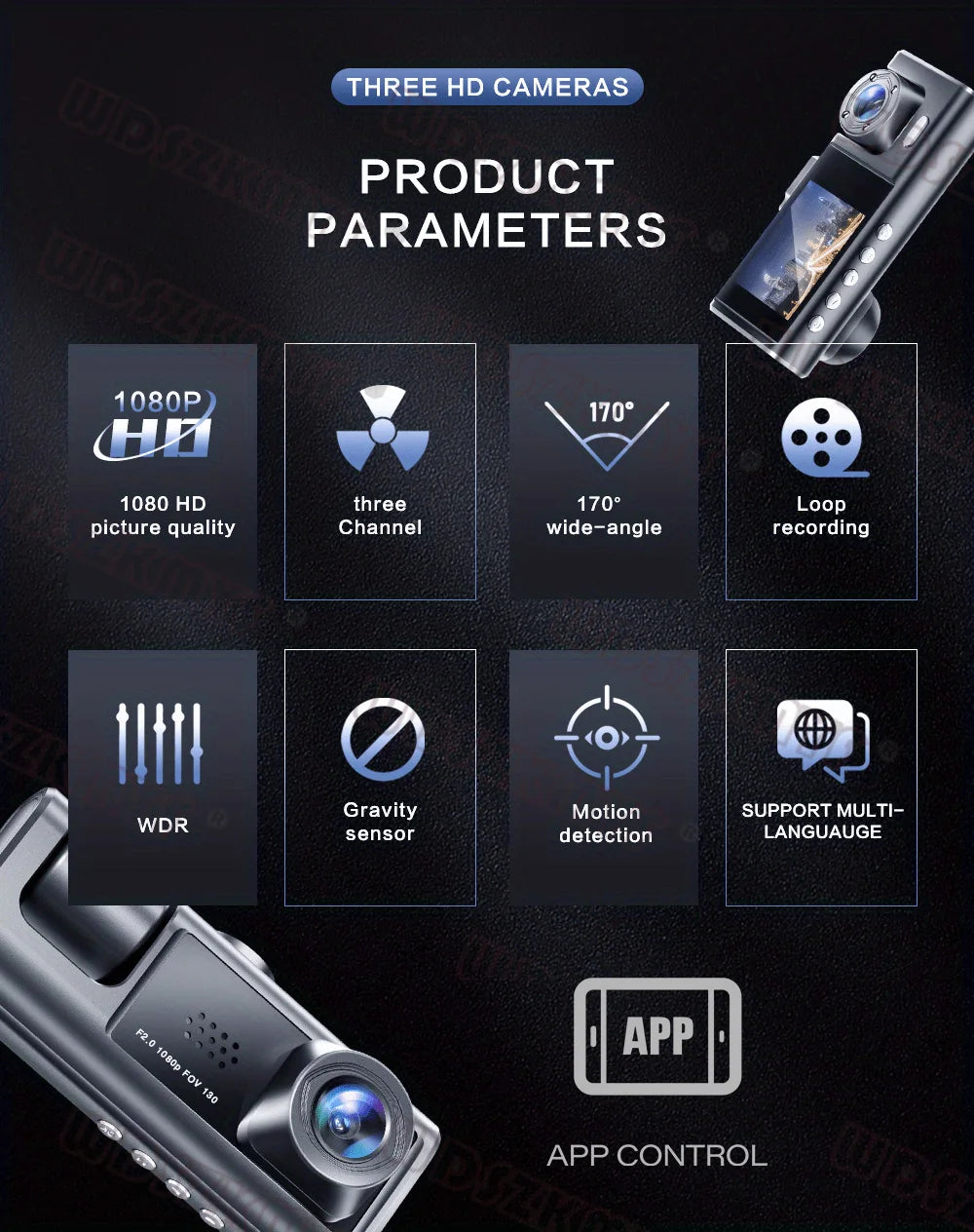The new high-definition 3-lens dash cam features built-in WiFi support for Android iPhone connectivity, making it easy for your phone to view videos.